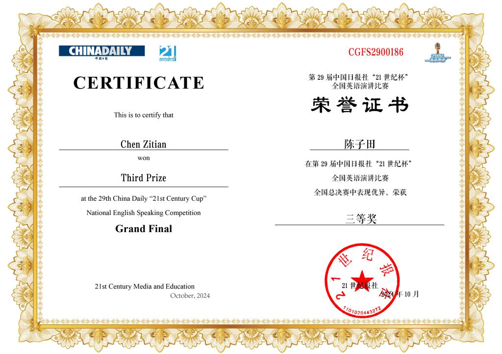 2022级英语5班学生陈子田在指导教师董新的耐心指导下,比赛中沉着冷静,思路清晰,表达流畅,最终荣获全国总决赛三等奖。