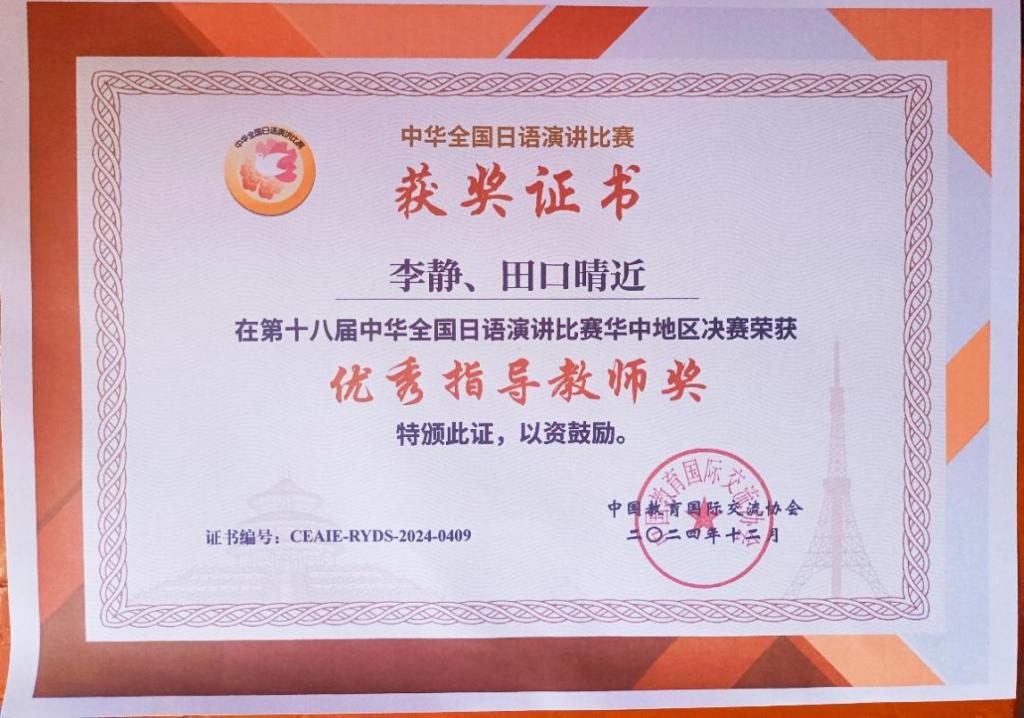 近日,第十八届中华全国日语演讲比赛华中赛区决赛在华中师范大学隆重落下帷幕,我校日语专业2022级王美琳同学在李静老师和田口晴近老师的指导下荣获华中赛区决赛三等奖。