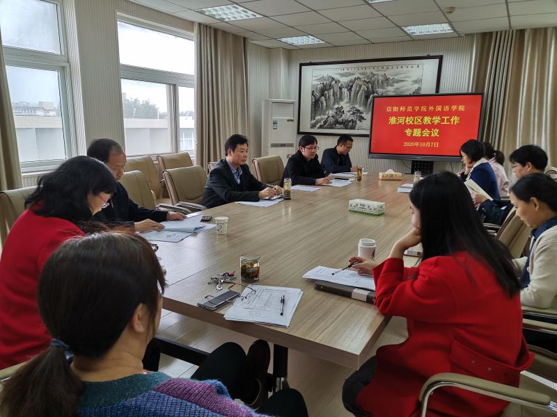 淮河校区第四次教学工作专题会议在人文楼五楼会议室召开。学院院长蔡满园、副院长姚光金、英语系负责人、全体淮河校区任课教师、教务办工作人员参加了会议。会议由姚光金主持。