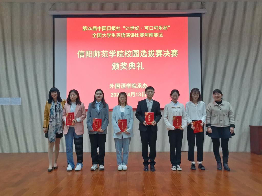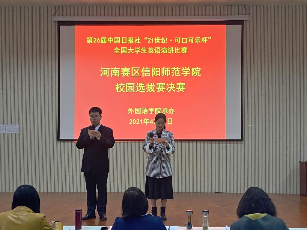承办的第二十六届中国日报社“21世纪可口可乐杯”全国大学生英语演讲比赛河南赛区信阳师范学院校园选拔赛决赛于人文楼报告厅圆满落幕。拷贝漫画