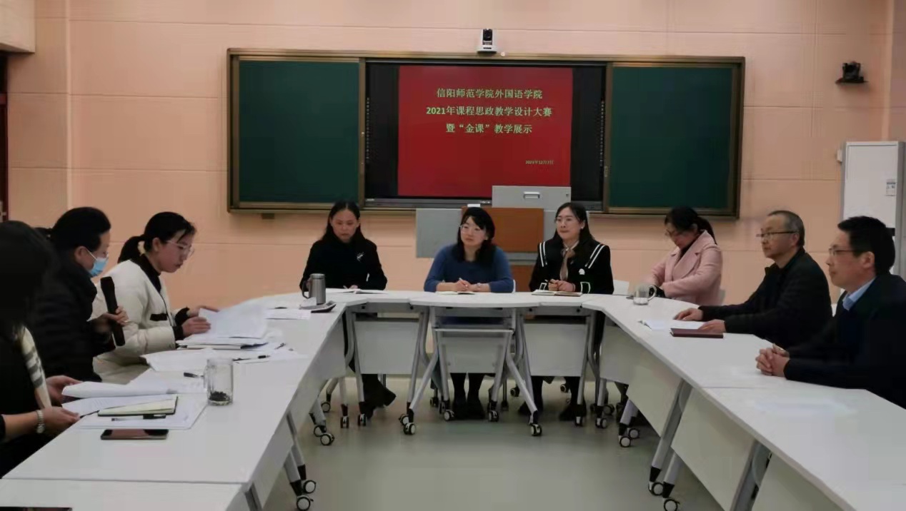 课程思政教学设计大赛暨“金课建设”研讨会。学院党委书记陈铭,副院长吴向东、余永锋、郭敏及各系、教研室主任和教学督导专家共同观摩了参赛老师们的课程设计展示,本次比赛包括两个环节,分别是课程视频展示和现场教学设计说课,评委根据课程思政教学竞赛标准进行评分。经过激烈的角逐,日语系李静老师、二外教研室曹慧琳老师获一等奖;英语系傅翀老师和杨慧芳老师获二等奖。随后,与会全体人员针对“金课建设”和如何开展课程思政教学进行了专题研讨。各系、教研室主任及教学督导专家纷纷从教学内容设计、教学目标、课程思政融入英语课堂的策略等角度发表了自己的意见。