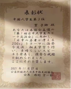 近日,由日中交流协会举办的中日大学生演讲比赛在日本东京都港区隆重举行,本次中日大学生演讲比赛面向全日本招募参赛选手,我校拷贝漫画 日语系在日交换生贾子卿从230余名参赛选手中脱颖而出,突破层层选拔,成功晋级为本次演讲比赛的决赛选手。本次演讲比赛由一名日本大学生和一名中国大学生组成一组,以“年轻人的可持续性发展”为题每组各自互相交流学习三个月之后参加演讲比赛,发表自己的观点。贾子卿和一名来自和歌山的日本女大学生组成一组,演讲中贾子卿同学提出的“男女平等”“容貌焦虑”等主题获得与会评委的一致好评,最终荣获本次演讲比赛的第三名。