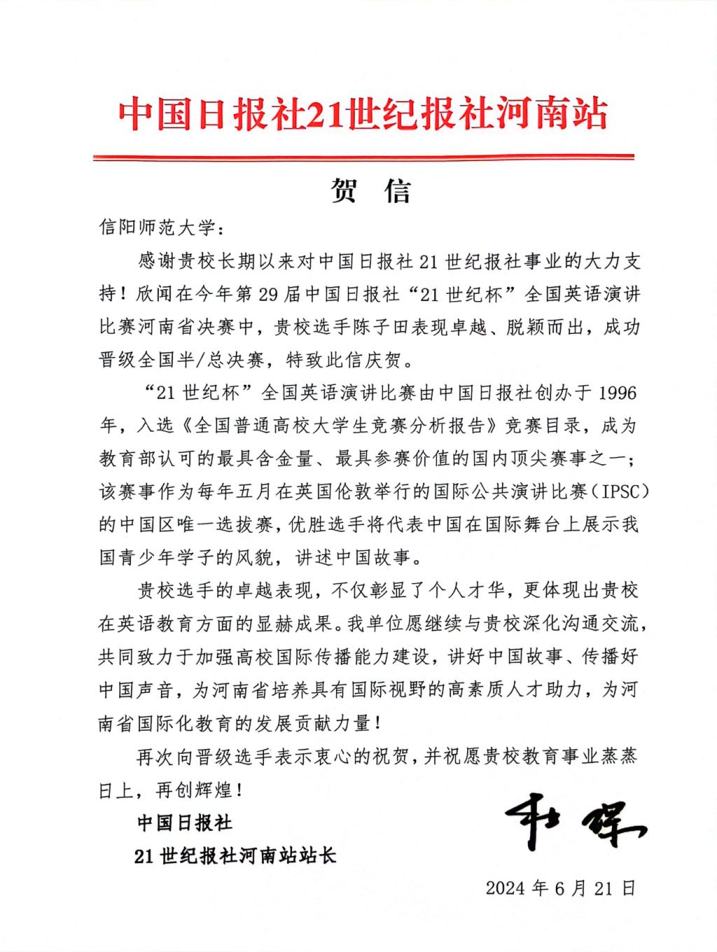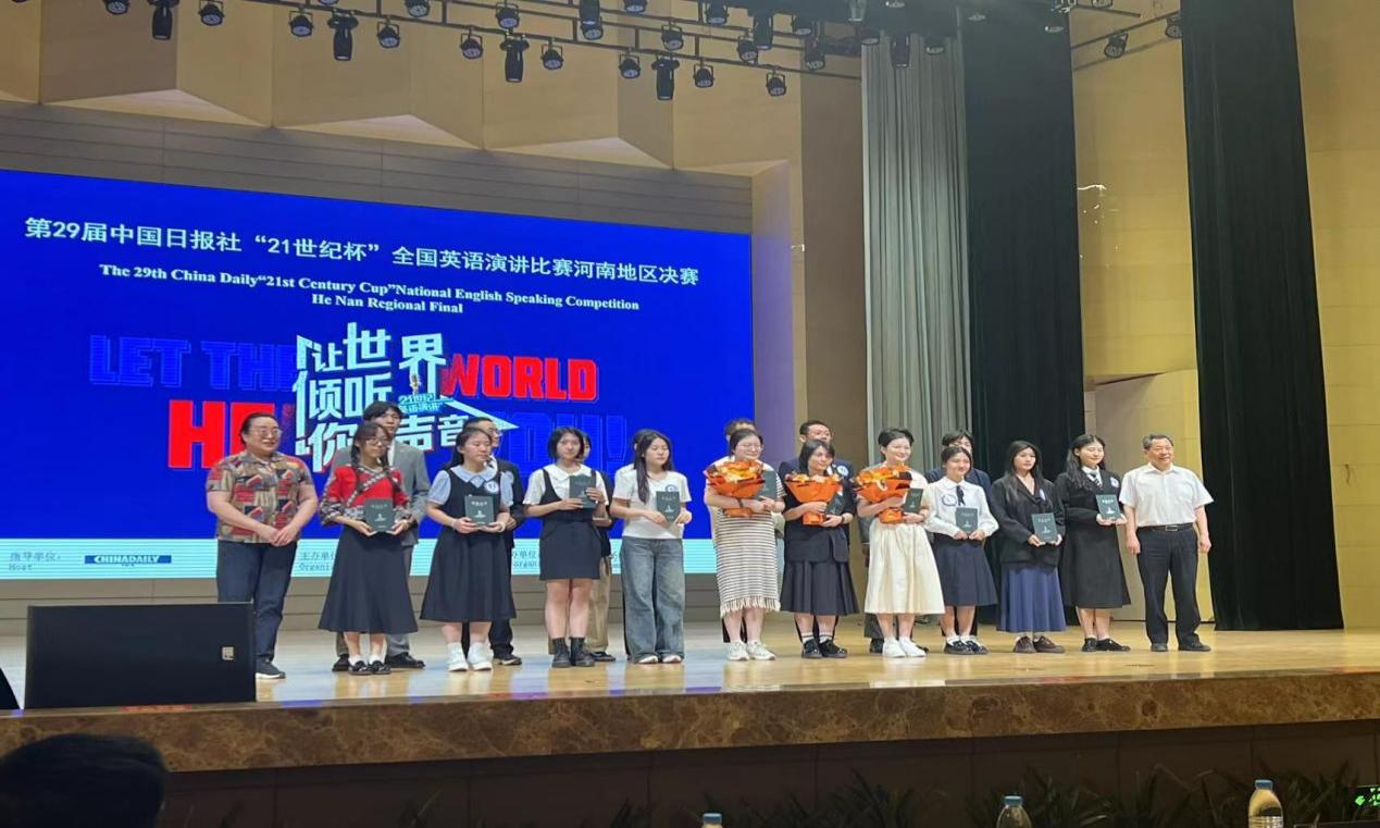 近日,第29届中国日报社“21世纪杯”全国英语演讲比赛河南地区决赛圆满落下帷幕,我校选手陈子田和李姿在指导教师董新和周雪的精心指导下分别荣获河南省总决赛二等奖和三等奖,陈子田成功晋级全国总决赛。中国日报社21世纪报社河南站为我校发来贺信,对我校选手的优异表现给予了高度好评。