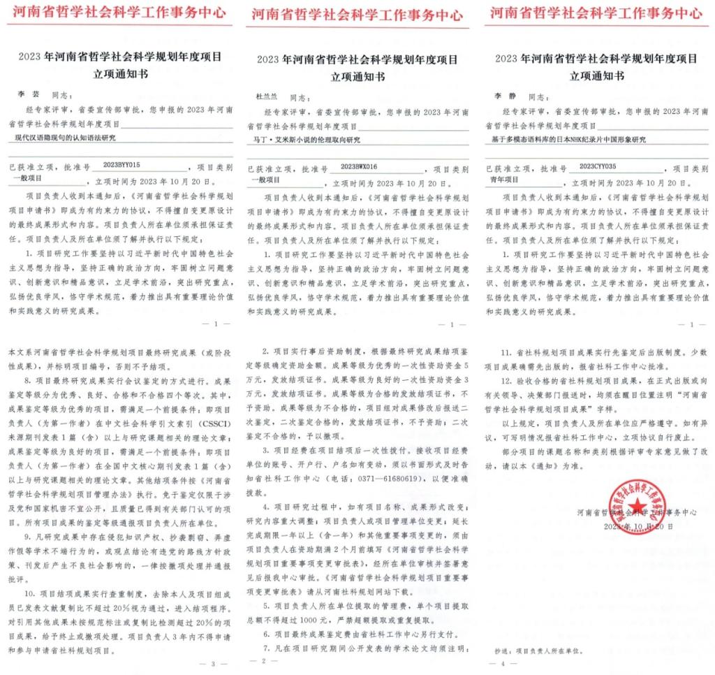 三位老师获得立项,分别为:英语系李芸老师申报的课题《现代汉语隐现句的认知语法研究》、日语系李静老师申报的课题《基于多模态语料库的日本NHK纪录片中国形象研究》和英语系杜兰兰老师申报的课题《马丁·艾米斯小说的伦理取向研究》。