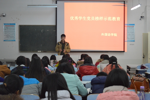 在人文楼607教室召开优秀学生党员榜样示范教育交流会,优秀学生党员代表刘亚凯、李菲应邀担任主讲嘉宾。38名党员发展对象参与交流会。