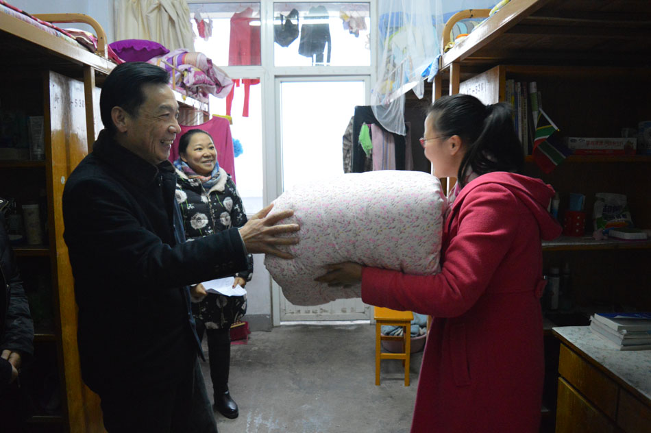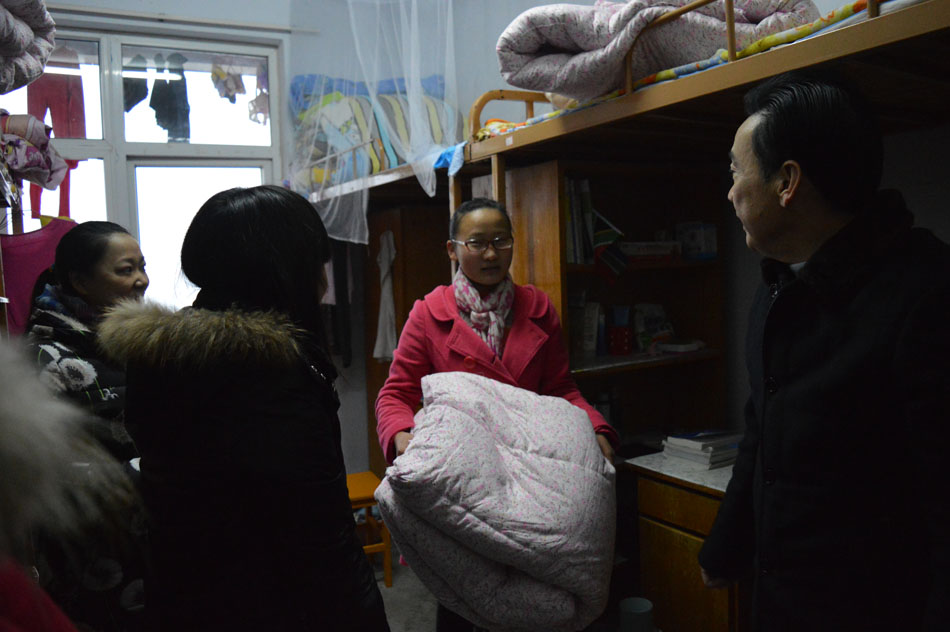 党委书记周学红,党委副书记陈铭和各年级专职辅导员一同前往学生宿舍为家庭经济困难学生发放过冬棉被,送去学院温暖。