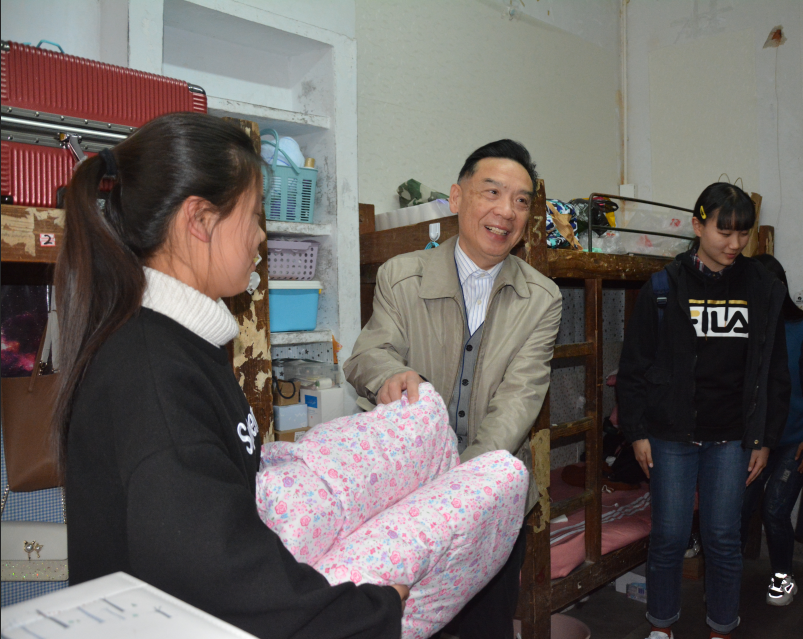党委书记周学红,副院长朱丽,党委副书记柏孟仁,党委委员余永锋,专职辅导员孔宪巍、孙桢桢一同走访学生宿舍,为家庭经济困难学生发放爱心棉被。