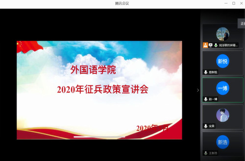 5月29日晚7点通过腾讯会议开展征兵政策宣讲会,参会人员实现各年级各班级全覆盖,为大学生进行了及时的应征入伍政策和国防知识宣讲普及,会议由武装干事孙桢桢主持。
