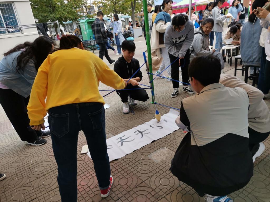 心理游园会活动的主题为“‘疫’路同心”,包括“抗‘疫’神笔”、“‘病毒’爆破计划”和“一心‘移疫’”三项内容。“抗‘疫’神笔”要求团队成员借助拉绳,从不同方向共同牵引一支大毛笔来书写文字,参与者们整个过程中不得接触毛笔,并需按照要求完成规定的书写任务;“‘病毒’爆破计划”要求团队成员按照工作人员提供的模型卡迅速搭建好模型,并在规定时间内一鼓作气吹爆气球,吹爆气球数量最多者获胜;“一心‘移疫’”则要求团队每轮派一名组员到固定区域内浏览三十张代表着数字的卡片,并按照从小到大的顺序收集卡片交给工作人员,其他成员在区域外对成员代表提供语言上的帮助。参与学生在活动中热情高涨,劲头十足,相互配合,勇于挑战,顺利完成了每一个活动任务,也从中体会到了团队合作的必要性和重要性,充分展现了本届心理健康教育宣传周“同心抗‘疫’,青春绽放”的活动主题。