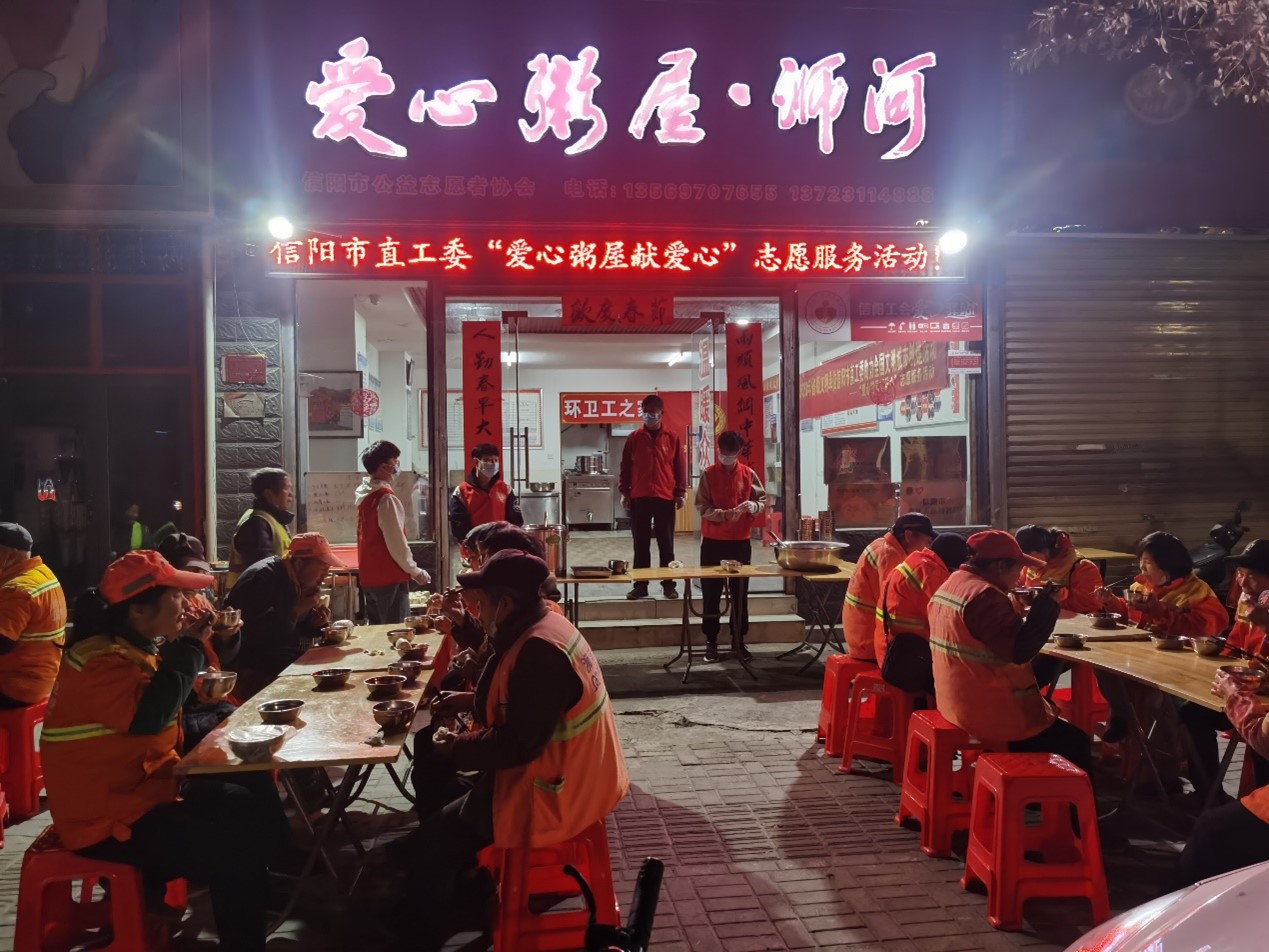 开展献爱心志愿服务活动。组织学院志愿者前往浉河区爱心粥屋进行志愿服务活动,志愿者们分工合作,打扫卫生、清理物品、为前来就餐的老人和环卫工人们送上一碗热乎乎的爱心粥,以实际行动传承雷锋精神。