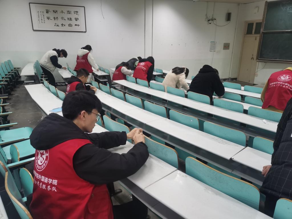 开展文明校园建设月活动。通过组织学院志愿者打扫校园卫生、规范电动车停放、清理人文楼教室桌面纸屑等活动,营造干净整洁的校园环境,在日常生活中将雷锋精神内化于心、外化于行。