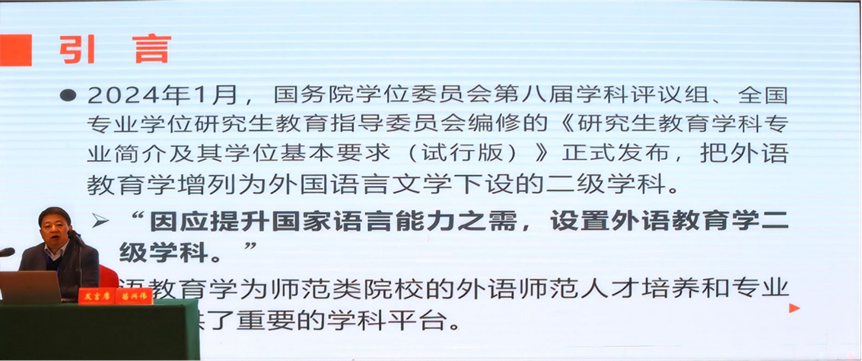 北京师范大学苗兴伟教授围绕“师范类院校外语教育学学科建设的路径”,系统阐释外语教育学学科建设路径,强调其对于破解“有教学无学科”困境的意义。提出师范院校应发挥制度资源优势,遵循师范性等基本原则,构建“4-3-2”课程体系,即四个课程模块、三个培养层次、两个融合维度,培养具备理论研究能力、实践创新能力和国际视野的外语教育人才。