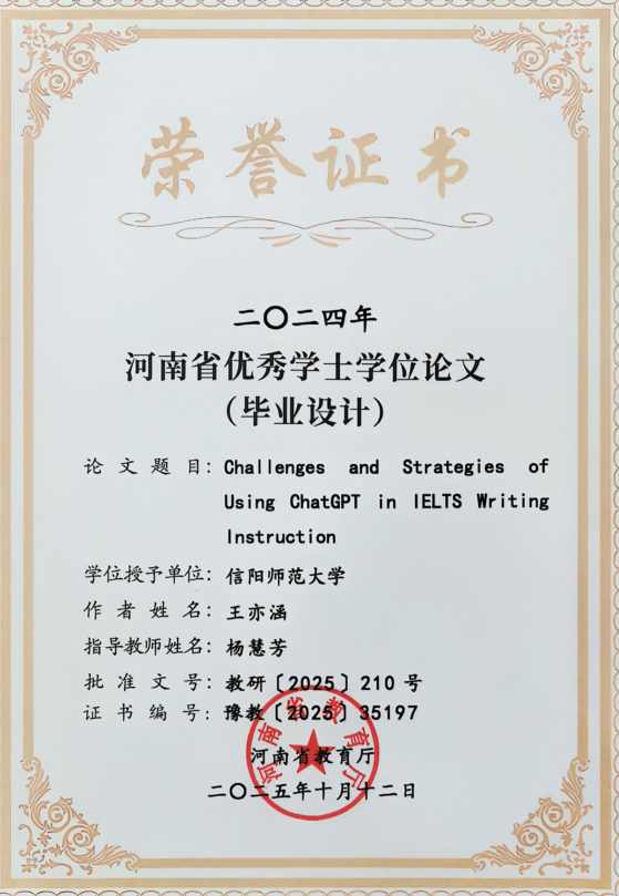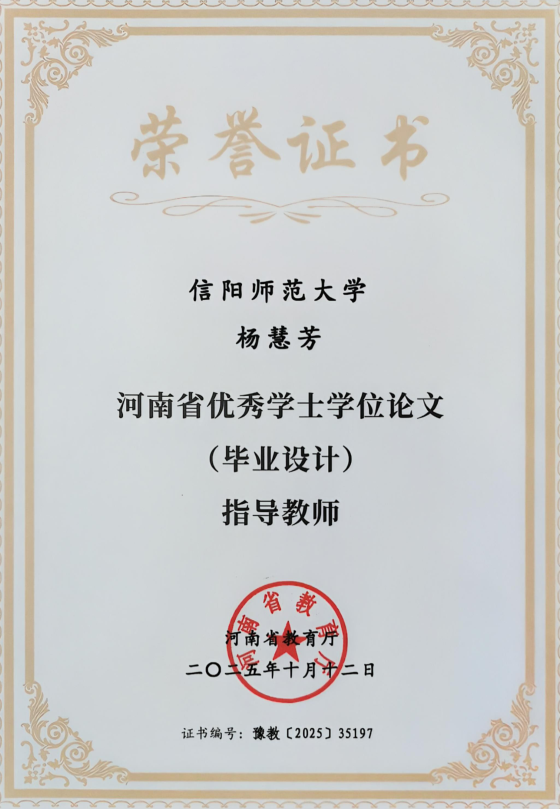 近日,河南省教育厅发文(河南省教育厅教研[2025]210号)公布2024年全省优秀学位论文评比结果。拷贝漫画 杨慧芳老师指导2020级英语专业王亦涵同学完成的本科学位论文被评为“优秀学士学位论文”。