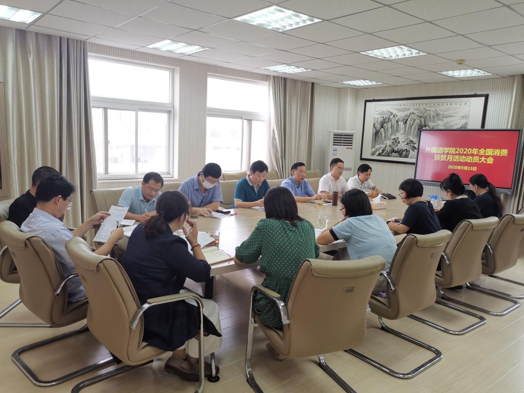 消费扶贫月活动专题会议在人文楼五楼会议室召开。学院领导班子成员,各系、室负责人,全体党支部书记、辅导员和班主任参加会议。会议由学院党委副书记柏孟仁主持。
