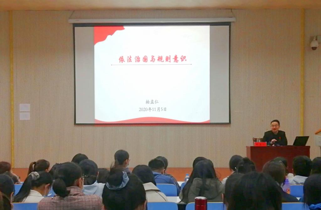 报告以“依法治国与规则意识”为题,阐述了全面依法治国基本方略的时代及历史背景,释明了全面依法治国战略的内涵及重大意义,指出了大学生牢固树立规则意识的具体遵循。报告通过若干经典案例,从刚性规则和柔性规则两个方面,为同学们详细解读了与大学生活联系密切的国家法律法规、学校规章制度、学院管理规定以及道德规范、文明公约、社交常识等相关内容,引导同学们牢固树立规则意识。柏孟仁希望同学们能够遵守法律法规,严守校规校纪,牢记青年使命,担当时代责任,勇做中国梦的追梦者和圆梦人。