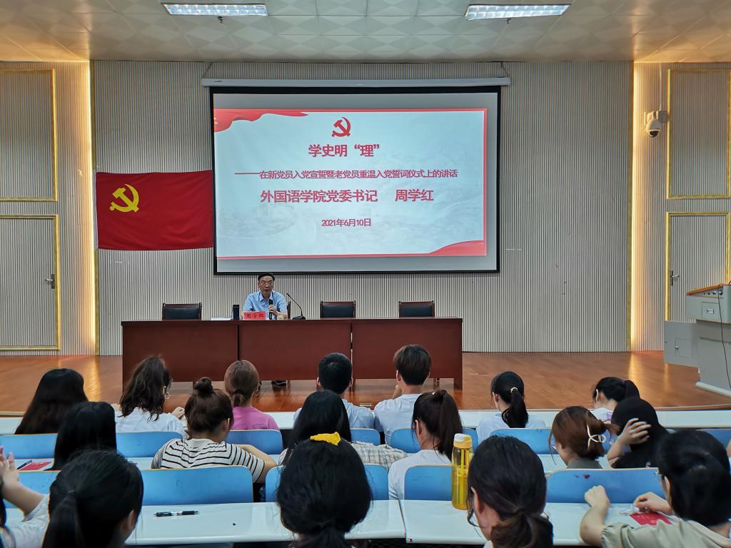 在人文楼报告厅举行新党员入党宣誓暨老党员重温入党誓词仪式。学院党委书记周学红、党委副书记柏孟仁出席会议,各学生支部书记和全体学生党员参加了此次大会。会议由专职组织员陈龙主持。