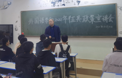 于人文楼101教室组织召开2021年秋季征兵政策宣讲会,学院党委副书记高彦伟、武装干事孙桢桢、退役大学生士兵张慧娟及2021级全体男生参加会议。宣讲会由孙桢桢主持。