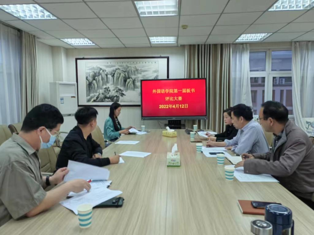在人文楼501会议室召开“第一届外文板书简笔画活动”评审会,学院各基层教学组织负责人担任评委。