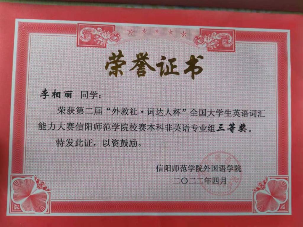 二、全国高等学校大学外语教学研究会、中国高校英语写作教学联盟联合主办覆盖全国在校大学生的英语词汇大赛。公共外语教研室老师指导学生获奖部分证书如下: