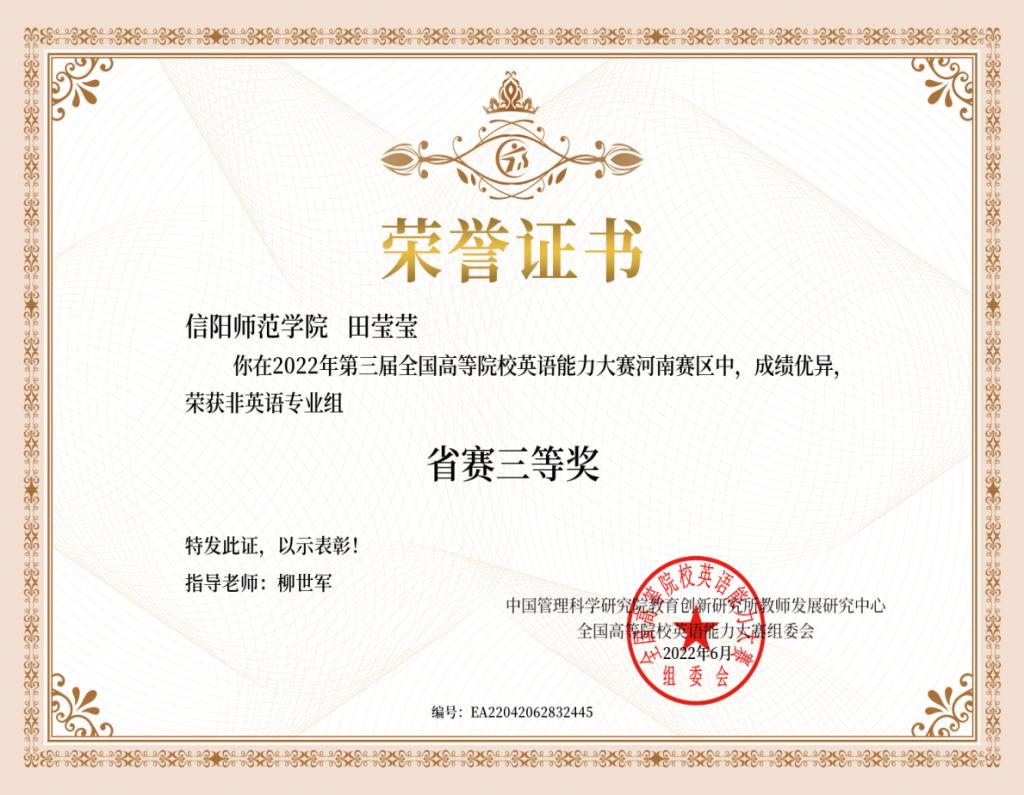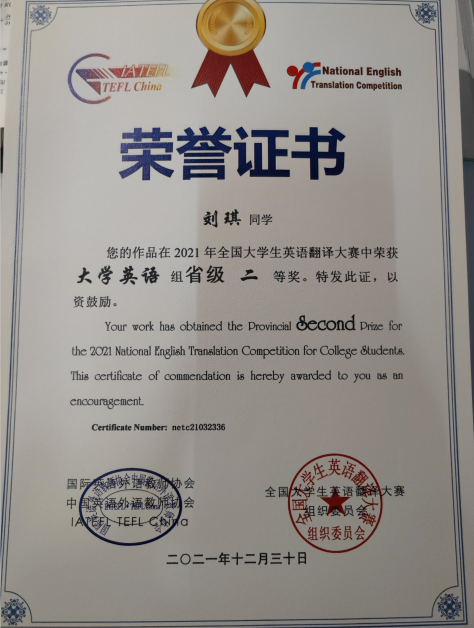 一、2022年全国大学生英语语法竞赛获奖成绩证书如下: