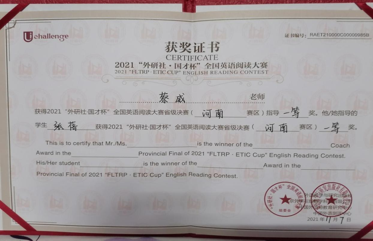 五、此前,由蔡威副教授指导的学生收到2021年“外研社 国才杯”全国英语阅读大赛,获得河南赛区一等奖,证书如下: