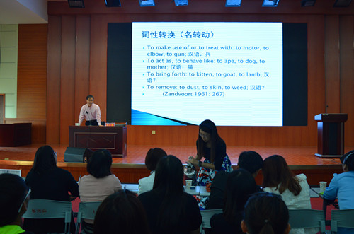 首先,刘世理简要介绍了束定芳教授,并对他的到来表示热烈欢迎。束定芳教授从词性转换、缩略语、成语三个方面着重讲解词汇的转喻现象,提出了许多新颖独到的观点,深入浅出地分析语法转喻中的中英文化交融现象,建议在座师生要了解文化差异,注意语言的使用与表达。束定芳教授旁征博引,与观众互动频繁,现场气氛轻松愉快。他风趣幽默的话语、鲜活生动的事例、丰富渊博的知识赢得了师生们阵阵掌声。