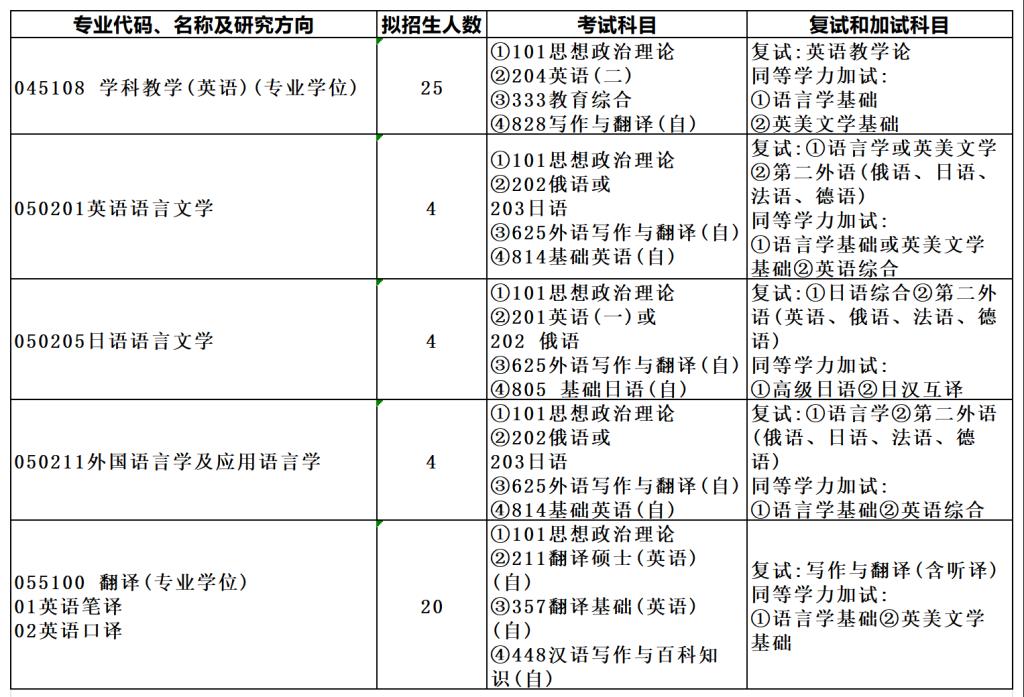 英语语言文学、外国语言学及应用语言学专业参考书目: 王振昌主编《高级英语写作》外语教学与研究出版社,2009;丁往道、吴冰主编《英语写作基础教程》高等教育出版社,2011;余立三主编《新编汉英翻译教程》商务印书馆,1985。 日语语言文学专业参考书目: 聂中华主编《日语本科论文写作指导》大连理工大学出版社,2014; 朱巨器主编《日语论文写作教程》上海大学出版社,2005; 梁传宝、高宁主编《新编日汉翻译教程》上海外语教育出版社,2008 |